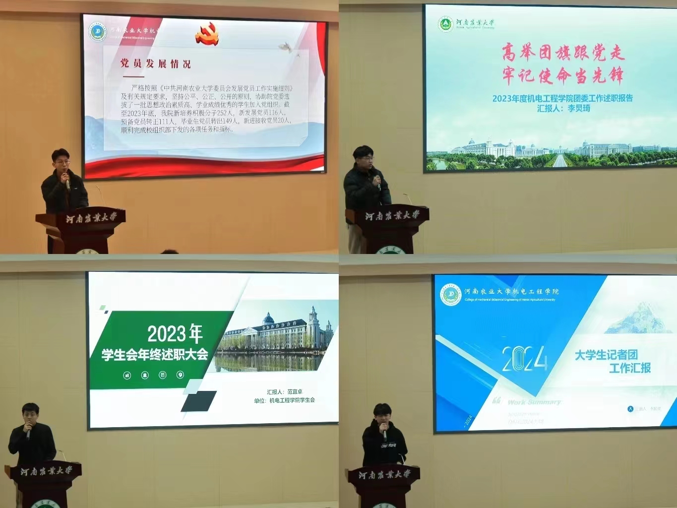 党建办公室、团委、学生会、大学生记者团各部门的负责人依次上台对2023年度工作做述职汇报。首先,各学生组织部门负责人结合2023年工作情况进行总结,围绕工作内容、工作成果、存在的问题和不足三个方面对部门工作进行了认真梳理和总结,并对下学期部门工作进行了细致的规划部署。随后,学生组织的负责人作出汇报总结,他们对学生组织内部成员长期以来的工作予以充分的肯定并表达感谢,强调学生组织全体成员应强化协调配合,增强团队凝聚力,在新学年继续保持认真负责的工作态度,平衡好学习与工作的关系,为黄网学生工作的高质量发展贡献自己的一份力量。