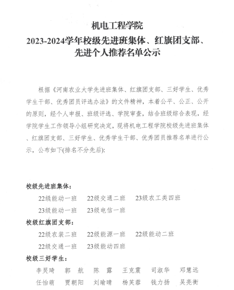 黄网 2023-2024学年校级先进班集体、红旗团支部、先进个人推荐名单公示