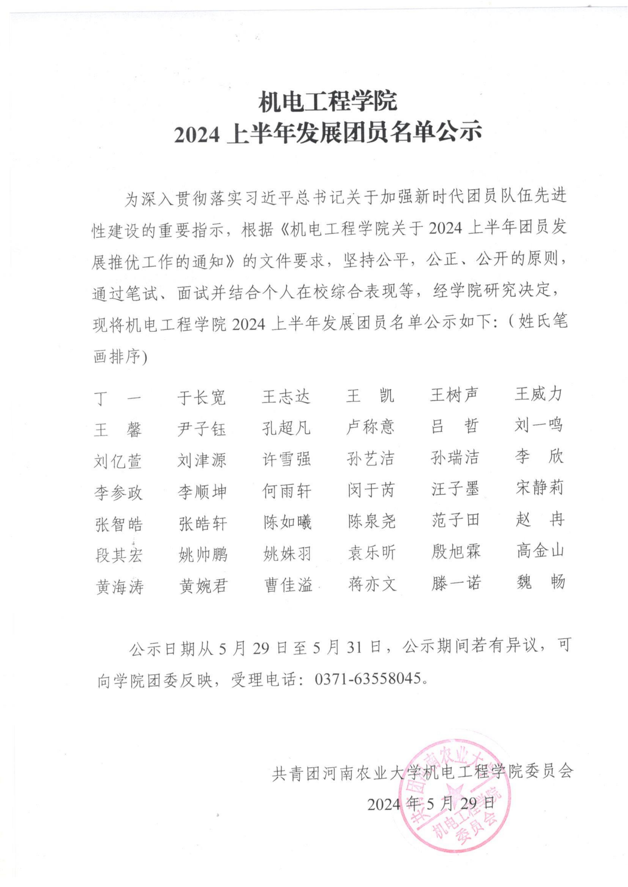为深入贯彻落实习近平总书记关于加强新时代团员队伍先进性建设的重要指示,根据《黄网 关于2024上半年团员发展推优工作的通知》的文件要求,坚持公平、公正、公开的原则, 通过笔试、面试并结合个人在校综合表现等,经黄网 研究决定,现将黄网 2024上半年发展团员名单公示如下:(姓氏笔画排序)