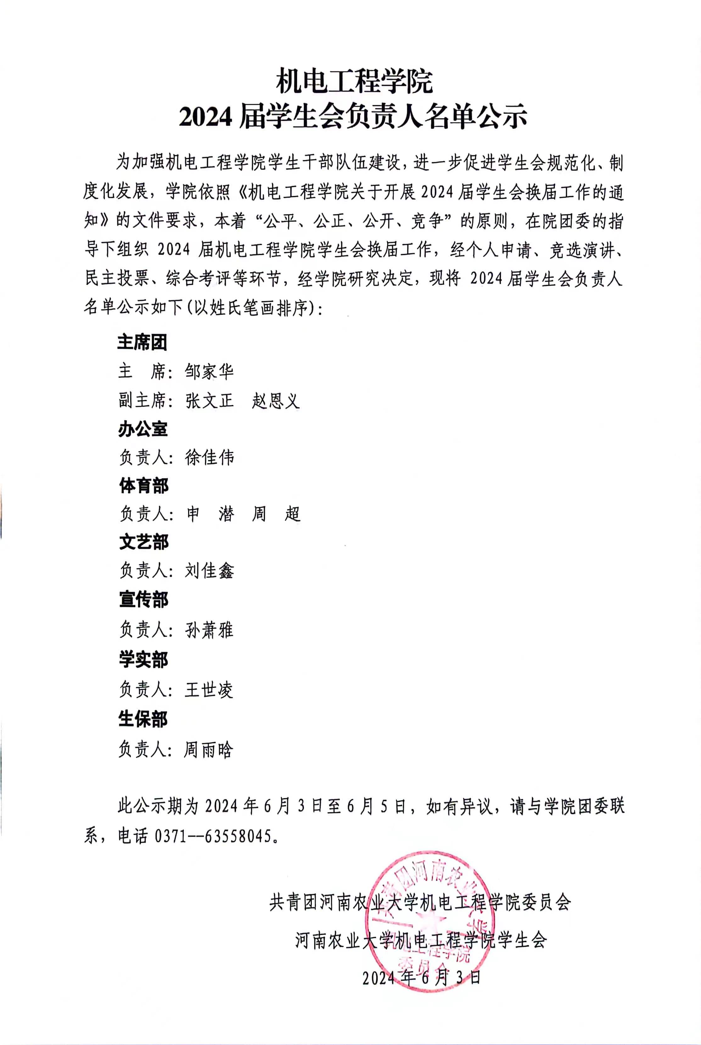 为加强黄网 学生干部队伍建设,进一步促进学生会规范化、制度化发展,黄网 依照《黄网 关于开展2024届学生会换届工作的通知》的文件要求,本着“公平、公正、公开、竞争”的原则,在院团委的指导下组织 2024届黄网 学生会换届工作,经个人申请、竞选演讲、民主投票、综合考评等环节,经黄网 研究决定,现将2024届学生会负责人名单公示如下(以姓氏笔画排序):