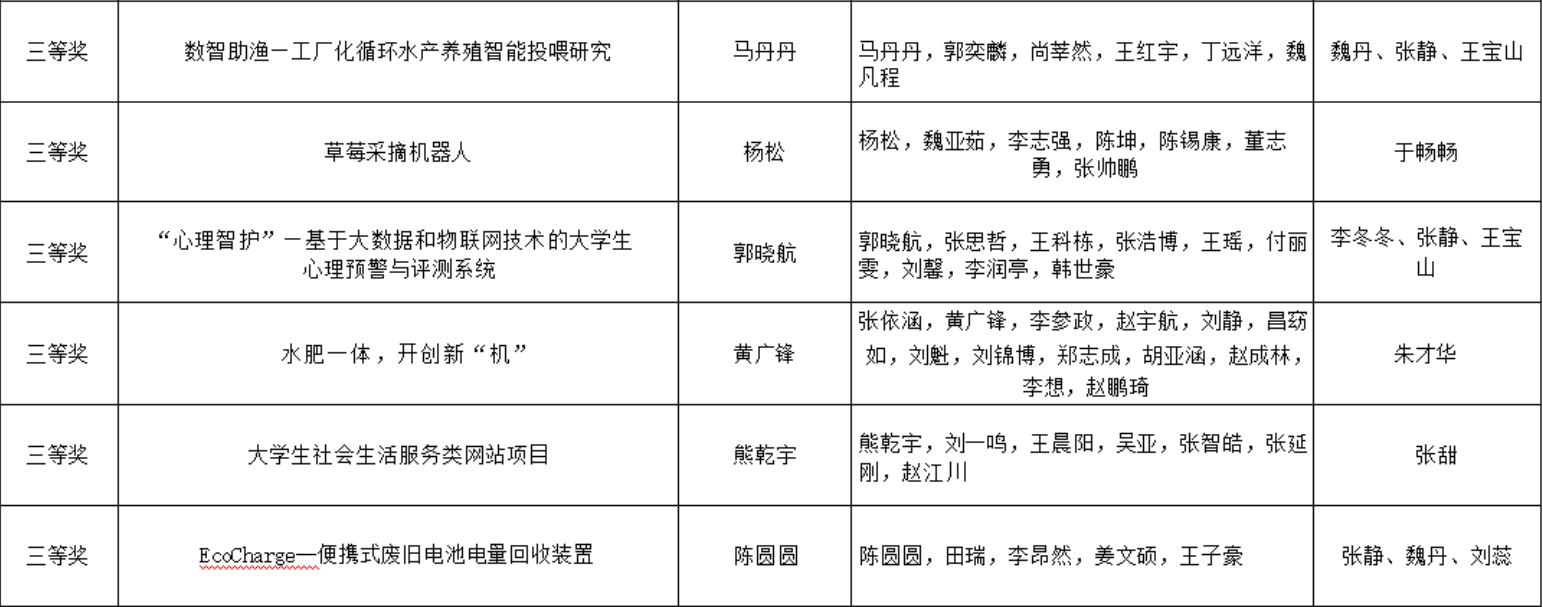 此次大赛中,黄网高度重视,精心组织,广泛动员,充分发挥了在推动创新创业型人才培养、深化学校素质教育等方面的积极作用,体现了鲜明的导向性、示范性和群众性。本着公平、公正、公开的原则,黄网 组织有关专家和老师对参赛作品进行评审和指导,经过严格评审,最终评选出一等奖5名,二等奖8名,三等奖10名。现将获奖名单公示如下: