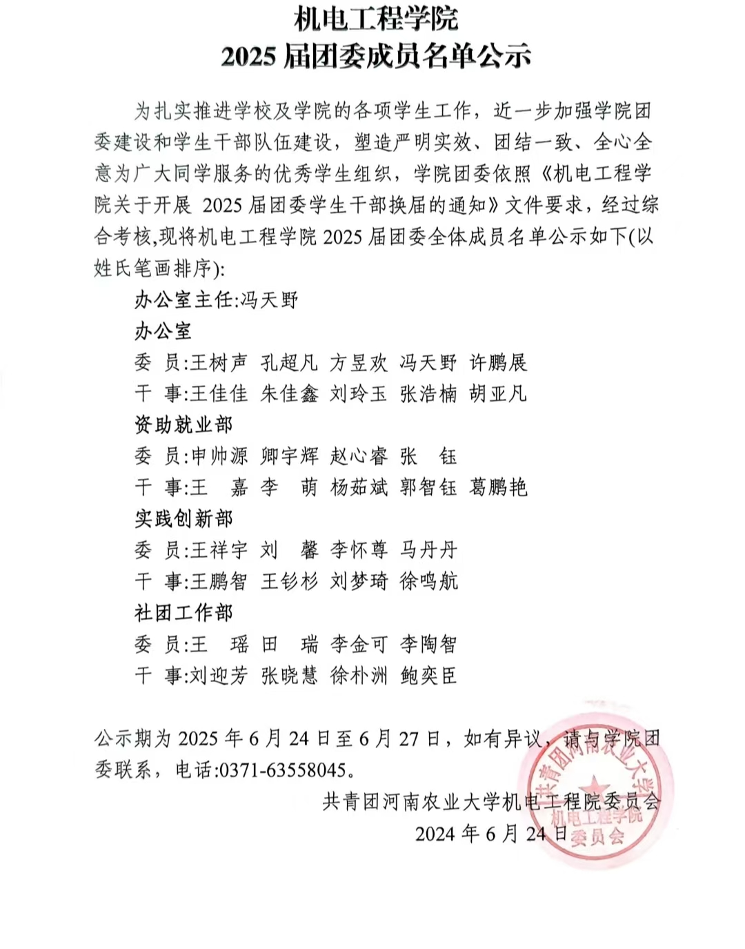 为扎实推进学校及黄网 的各项学生工作,近一步加强黄网 团委建设和学生干部队伍建设,塑造严明实效、团结一致、全心全意为广大同学服务的优秀学生组织,黄网 团委依照《黄网 关于开展2025届团委学生干部换届的通知》文件要求,经过综合考核,现将黄网 2025届团委全体成员名单公示如下(以姓氏笔画排序):