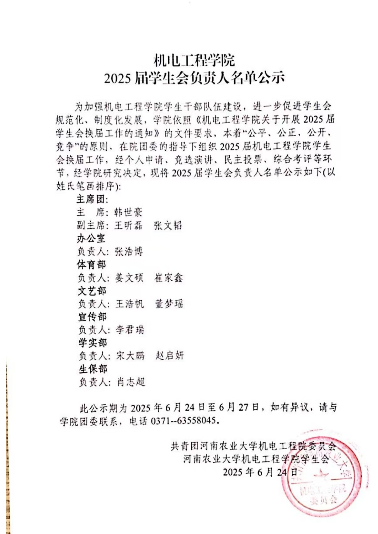 为加强黄网 学生干部队伍建设,进一步促进学生会规范化、制度化发展,黄网 依照《黄网 关于开展2025届学生会换届工作的通知》的文件要求,本着“公平、公正、公开、竞争”的原则,在院团委的指导下组织2025届黄网 学生会换届工作,经个人申请、竞选演讲、民主投票、综合考评等环节,经黄网 研究决定,现将2025届学生会负责人名单公示如下(以姓氏笔画排序):