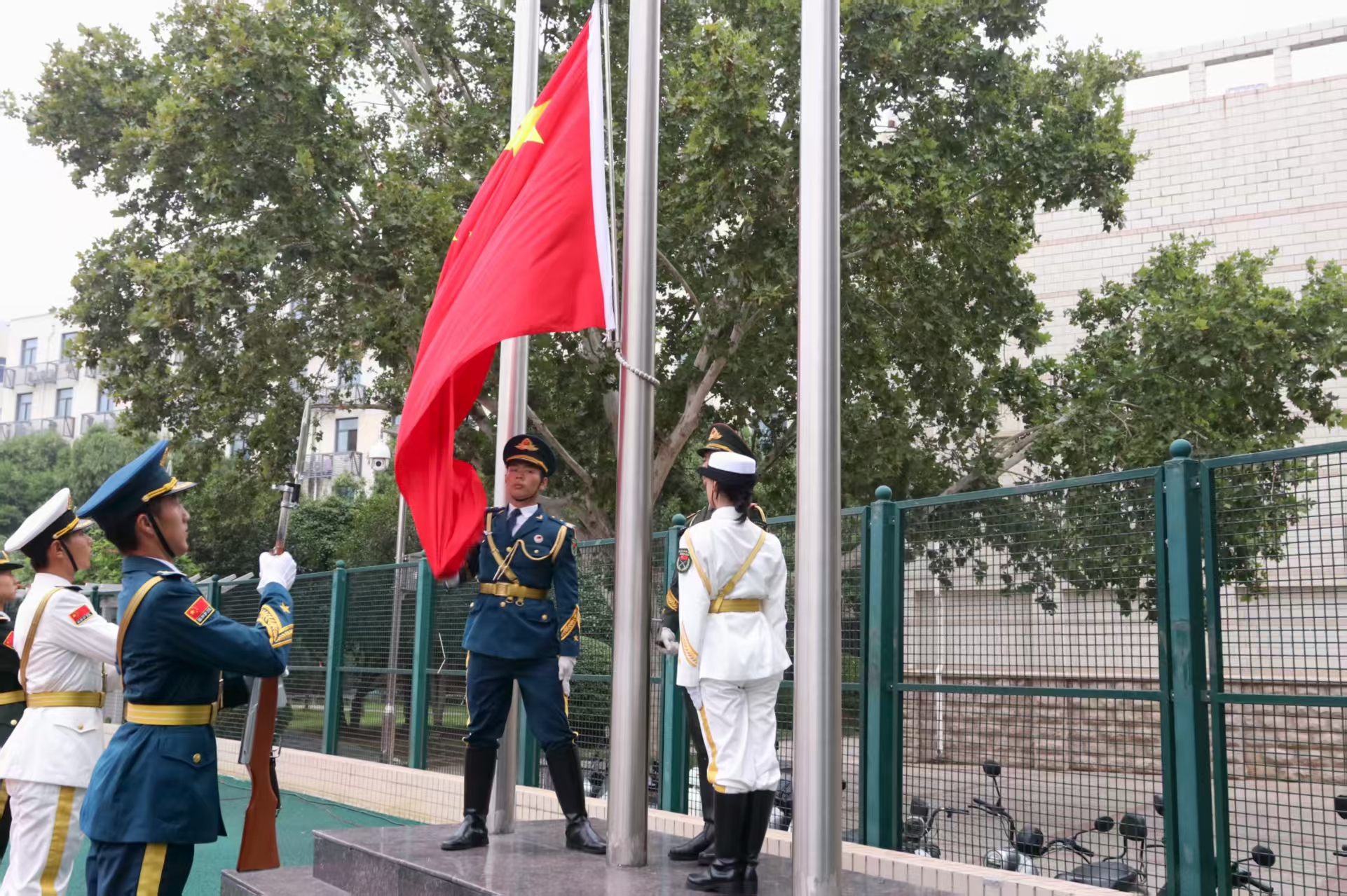 在激昂的《义勇军进行曲》中,国旗护卫队迈着整齐且矫健的步伐,神情庄严地将国旗护送至升旗台。伴随着国歌的旋律,五星红旗冉冉升起、迎风飘扬,全体师生庄严肃立,向国旗行注目礼。