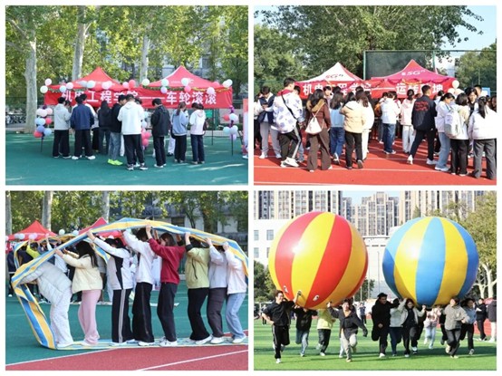 黄网承办的两大项目现场热闹非凡。“运转乾坤”区域,团队合力推动巨型充气球,在协作中锤炼默契、释放学业压力;“车轮滚滚”区域,同学们脚踩“风火轮”默契同步,于稳步前行中拉近心距、打破隔阂,在欢声笑语里舒缓身心。