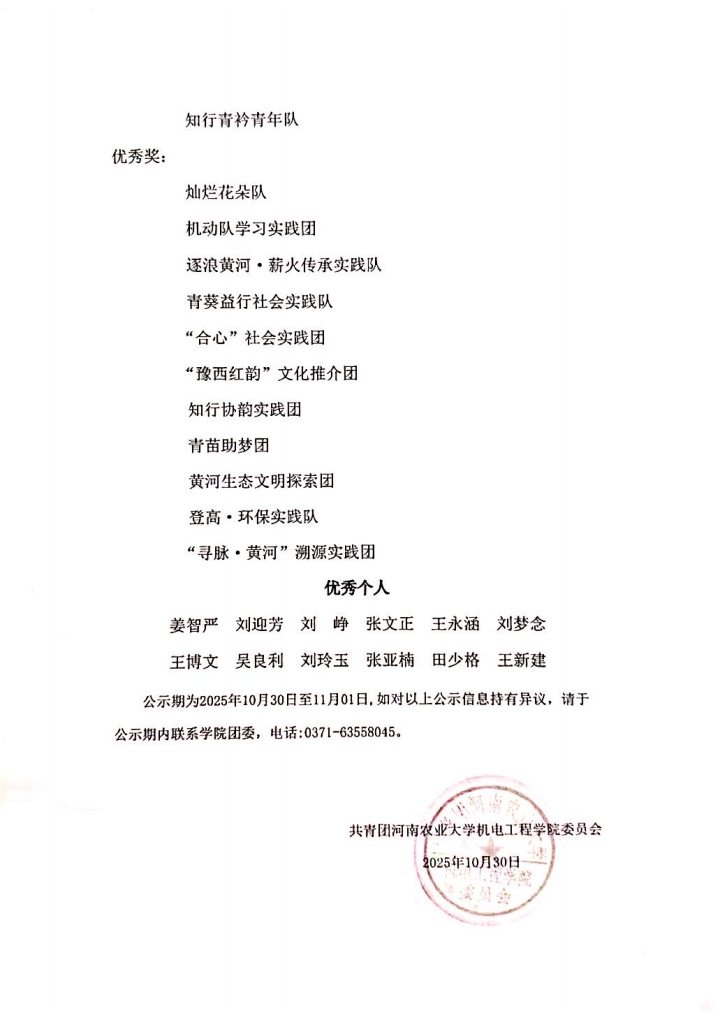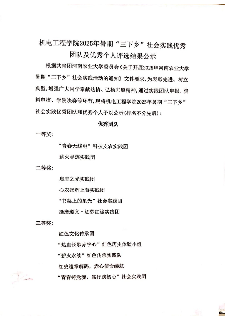 根据共青团黄网 委员会《关于开展2025年黄网 暑期“三下乡”社会实践活动的通知》文件要求,为表彰先进、树立典型,增强广大同学奉献热情、弘扬志愿精神,通过实践团队申报、资料审核、黄网 决赛等环节,现将黄网 2025年暑期“三下乡”社会实践优秀团队和优秀个人予以公示(排名不分先后):